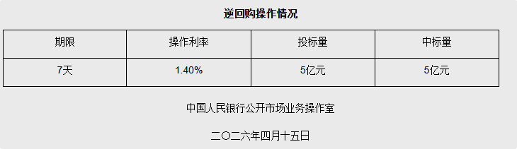 4月15日电 据央止网站新闻,2026年4月15日中原国民银止以牢固利率、数目投标体例启铺了5亿元7天期顺归买掌握,齐额知足了1级买卖商需要。详细环境以下: